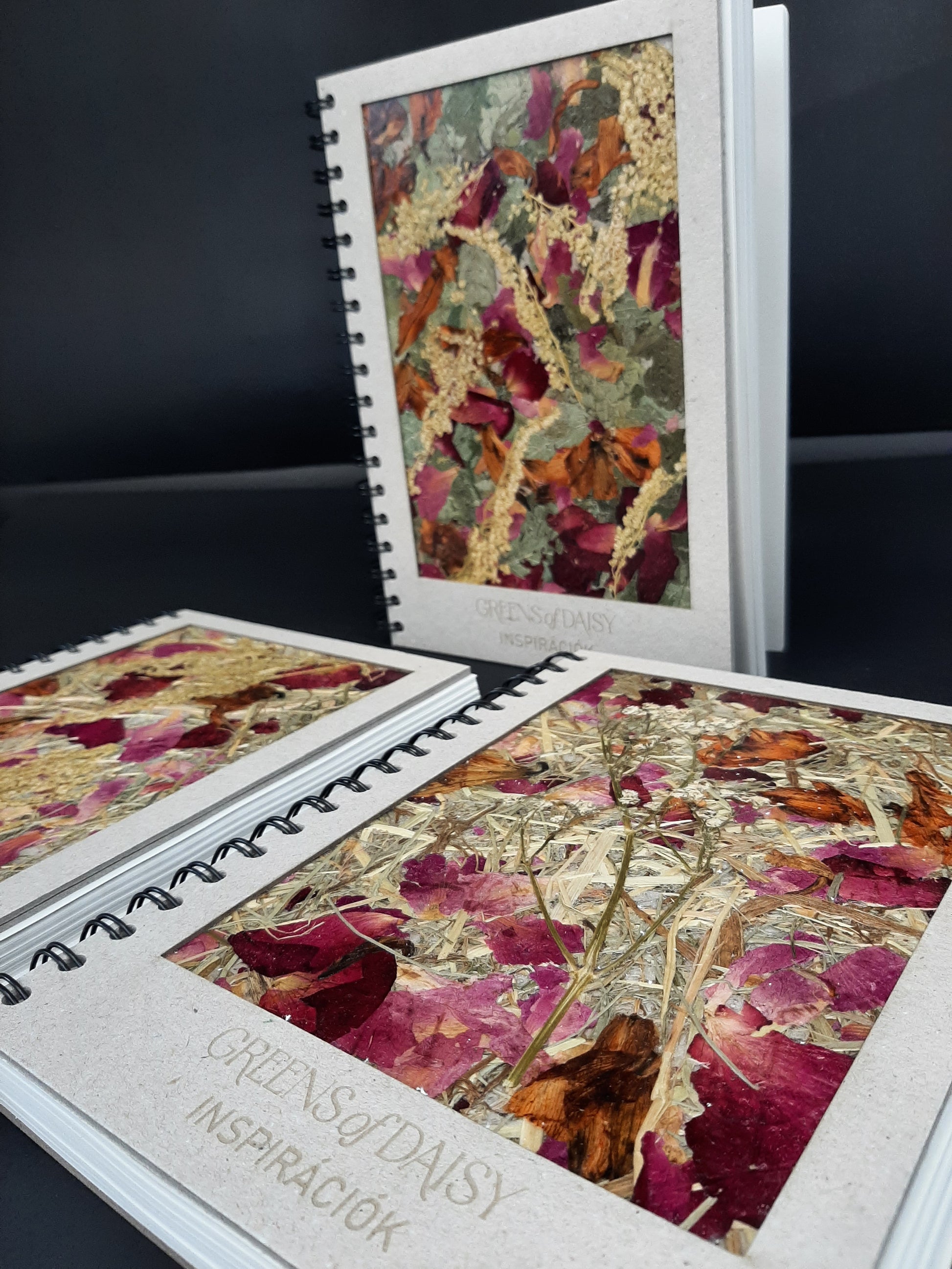 • Ez egy limitált példányszámú kiadvány, minden borító teljesen egyedi, valódi szárított virágokból, növényekből készül.