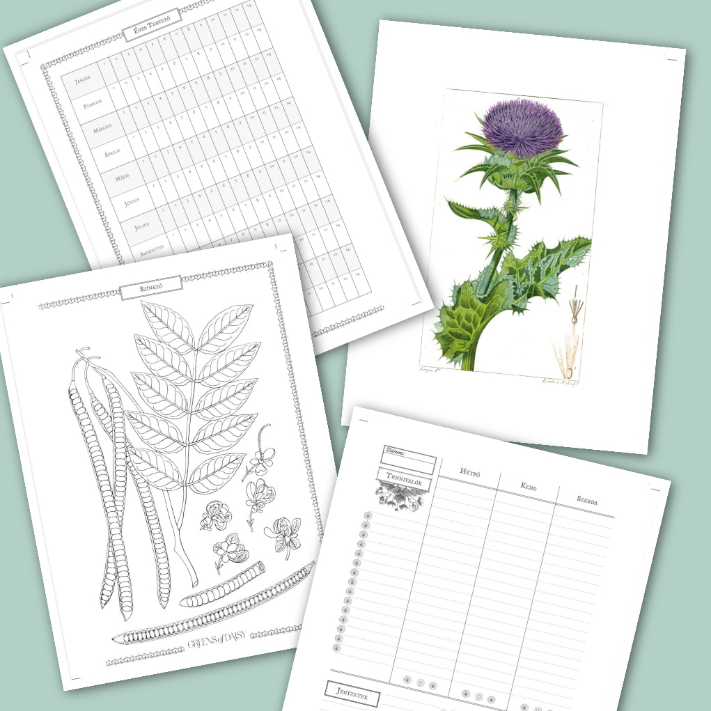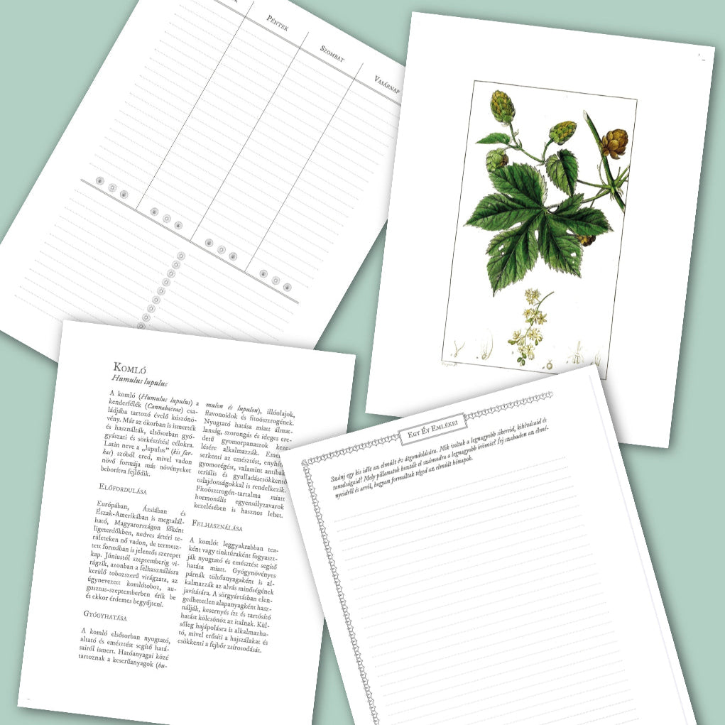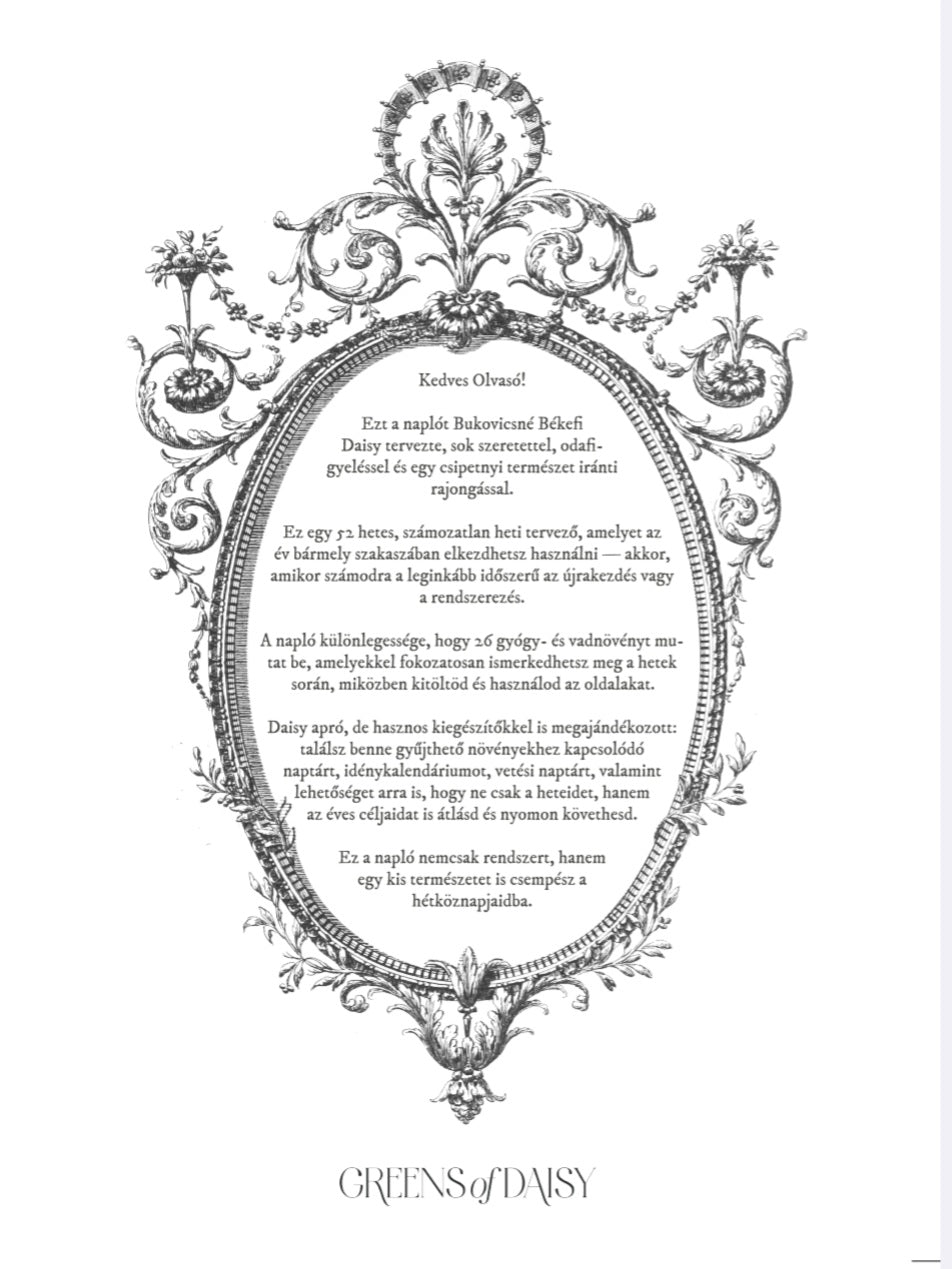 Újabb álom valósul meg! Egy saját tervezésű, gyógynövényes tematikájú, inspirációs, kreatív határidő napló! Ez egy 52 hetes, számozatlan heti tervező, amelyet az év bármely szakaszában elkezdhetsz használni – akkor, amikor számodra a leginkább időszerű az újrakezdés vagy a rendszerezés. A naptár különlegessége, hogy 26 gyógy- és vadnövényt mutat be, amelyekkel fokozatosan ismerkedhetsz meg a hetek során, miközben kitöltöd és használod az oldalakat.
