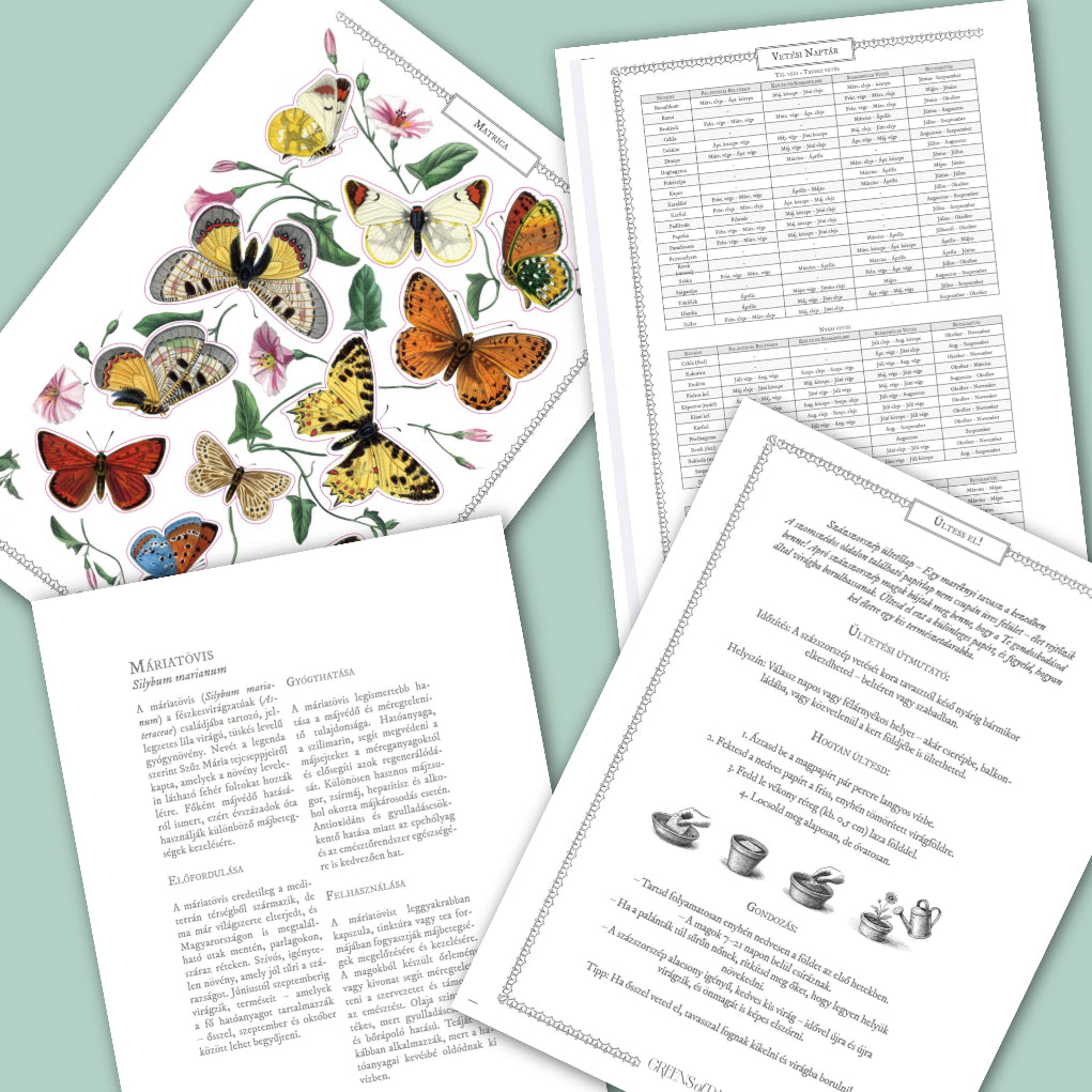 • Találsz benne növényes színezőket, pillangós matricákat, a gyógynövény gyűjtéshez felhasználható, ragasztható befőttesüveg címkéket is.